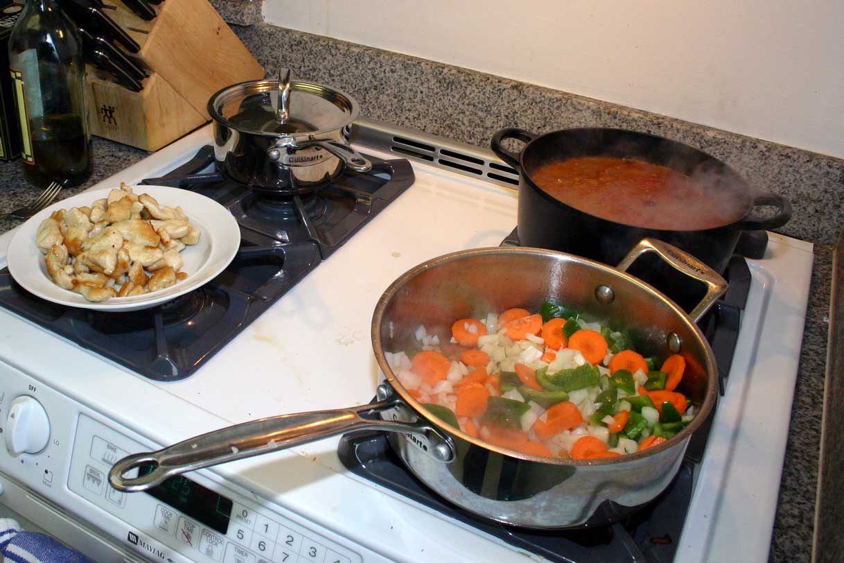 In some cases, though, recipes can collide in midstream, and I’ve found myself with all 4 burners occupied and not enough hands to keep them going! Just yesterday, I was making a bolognese sauce, an alfredo sauce, and an asian stir fry all at the same time. As I flicked the wok to keep the vegetables moving, I whisked with the other hand to keep the cream for the alfredo sauce from scalding! At one point, I was sure that I would make a mistake and flick vegetables into the cream sauce, or perhaps spill roux or parmigiano into the stir fry! Luckily, that didn’t happen!