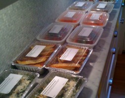 Once cooled and packaged, I put my pre-printed labels with the name, date and heating instructions on them so that the client will know exactly how to prepare them so that they serve up as if I had made them a la minute. I finish cleaning up. As you can imagine, a service can create a whole mess of dirty dishes, so I try as best as possible to clean as I go. I finish up, sweep and mop the floor, and leave the kitchen as I found it (sometimes cleaner.)