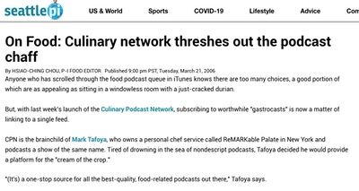Chef Mark Tafoya begins his ReMARKable Palate podcast, focused on exploring micro-regional cuisines and general food knowledge. He is featured in Bon Appetit Magazine in January 2006.